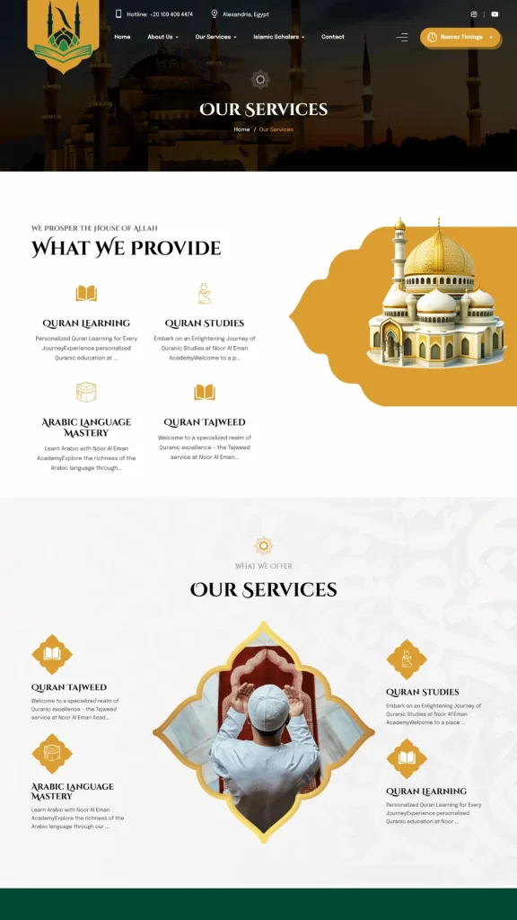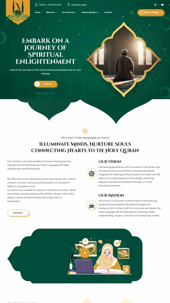 The primary goal of the Noor Al Iman Academy project was to build a modern, informative, and easy-to-navigate website that accurately represents the academy’s mission and services. Utilizing WordPress, we developed a responsive website that allows students and parents to learn about the academy, its courses, and enrollment procedures with ease. Key features of the website include: